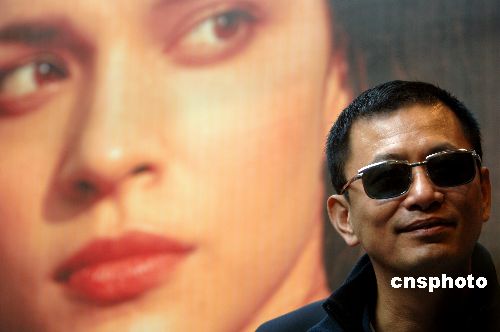 著名華人導(dǎo)演王家衛(wèi)在其首部英語(yǔ)電影《藍(lán)莓之夜》新聞發(fā)布會(huì)的海報(bào)前。
