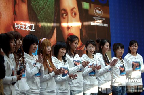 十一月二十一日,王家衛(wèi)聯(lián)合女性交友網(wǎng)站愛情公寓在北京長(zhǎng)城腳下公社舉辦新聞發(fā)布會(huì),通過(guò)愛情公寓征選的十位藍(lán)莓女孩集體亮相,他們還將搭乘藍(lán)莓巴士進(jìn)行為期一個(gè)月,走遍全國(guó)十個(gè)城市的旅程,女孩將會(huì)在愛情公寓網(wǎng)站中上傳每日旅行日記照片,最終由網(wǎng)友票選一位最具有藍(lán)莓精神的藍(lán)莓天使。片方希望通過(guò)這種形式宣傳,讓電影里的情節(jié)在生活中同樣可以實(shí)現(xiàn),并讓這十位藍(lán)莓女孩也有機(jī)會(huì)體會(huì)諾拉瓊斯在電影里的感情旅程。中新社發(fā) 廖攀 攝