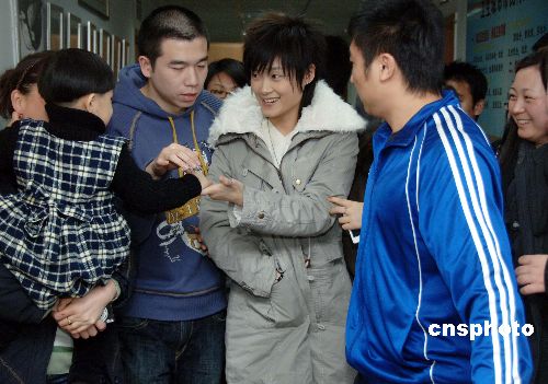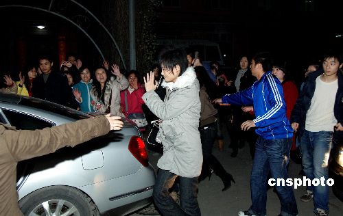 2007年12月16日晚,李宇春來到西安音樂臺接聽熱線,得到消息的百余名“玉米”蜂擁而至,爭相圍睹自己的偶像。中新社發 李海軍 攝
