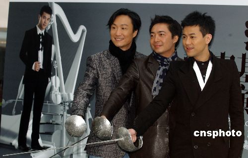 二月四日,香港歌星鄭中基(左)、梁漢文(右)與香港管弦樂團(港樂)第一副團長梁建楓,手持寶劍以“三劍俠”姿態宣布,三方將首度合作于二零零八年在紅館舉行三場演唱會。中新社發 蔡蔓莉 攝