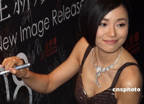 2月28日晚,香港紅星陳慧琳佩戴著價值千萬的珠寶,在北京舉行的香港“金至尊珠寶”2008新形象發布會上亮相。同時亮相的還有藝人張恒、唐嫣、高露、江一燕、丁柳元、陳虹池以及名模春曉等。中新社發 錢興強 攝