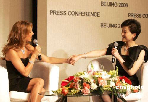4月12日,國際歌壇天后席琳·迪翁與中國好友楊瀾在北京與記者見面,介紹她們聯(lián)手打造的頂級鉆石品牌HV Love。席琳·迪翁曾在榮獲奧斯卡多項大獎的影片《泰坦尼克號》中擔任主唱。中新社發(fā) 張宇 攝