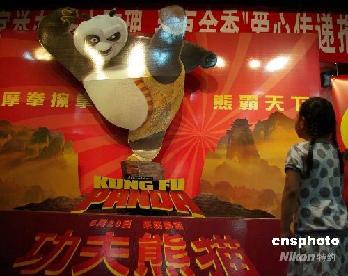 7月3日,北京一家影院《功夫熊貓》的海報吸引兒童。美國動畫片《功夫熊貓》在國內上映后,票房勢如破竹,一路飄紅。截止到上周日,影片全國票房達到9688萬元,破億目標近在咫尺,已成為最賺錢的進口動畫片。中新社發 九州 攝