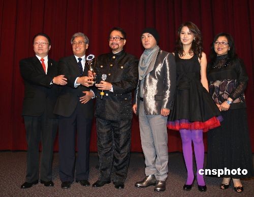 當?shù)貢r間11月4日,中美電影節(jié)在美國洛杉磯好萊塢開幕,中美電影明星齊集好萊塢。此次藝術(shù)節(jié)有100多部中國和美國電影參加競選“十佳影片金天使獎”活動。國產(chǎn)影片《投名狀》、《集結(jié)號》以及香港動作片《奪標》等獲得此項殊榮。中國領(lǐng)事館總領(lǐng)事張云、中美電影節(jié)主席蘇彥韜向香港動作片《奪標》劇組導演徐小明、知名演員張衛(wèi)健、黃翠和、和監(jiān)制徐李鳳鳴頒發(fā)“金天使獎”。中新社發(fā) 盧威 攝