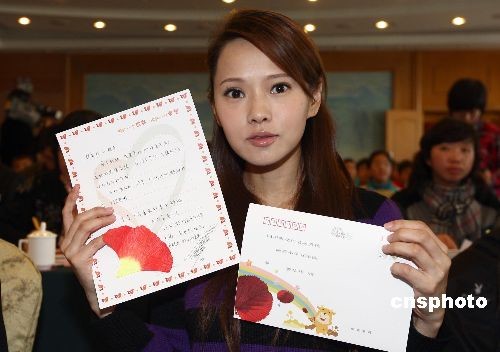 12月22日,愛心大使伊能靜在北京出席“新長城5·12災(zāi)區(qū)學(xué)生新春關(guān)愛行動”啟動儀式,并在愛心賀卡上親手為四川災(zāi)區(qū)小學(xué)生寫下新年祝福,這封賀卡將寄往映秀小學(xué)5年紀的賀華偉同學(xué)。參加活動的市民只需花費10元人民幣,就可為災(zāi)區(qū)學(xué)生郵寄一枚新年愛心賀卡,其中還包含有為“自強獎學(xué)金”捐獻的善款。首批賀卡是寄給映秀小學(xué)學(xué)生的,他們將最先收到這份新年禮物。中新社發(fā) 杜洋 攝