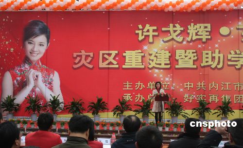 2008年1月6日,由中共四川省內(nèi)江市委、四川省內(nèi)江市人民政府主辦的“許戈輝災(zāi)區(qū)重建暨助學(xué)募捐活動(dòng)”在該市東興區(qū)大千廣場(chǎng)隆重舉行,香港鳳凰衛(wèi)視著名主持人許戈輝現(xiàn)場(chǎng)為“汶川大地震”災(zāi)區(qū)的貧困學(xué)子募集善款,受到當(dāng)?shù)厝罕姷膹V泛關(guān)注。在活動(dòng)現(xiàn)場(chǎng),許戈輝聲情并茂地暢談了自己在地震災(zāi)區(qū)的見聞,呼吁社會(huì)各界都來關(guān)注災(zāi)區(qū)、支援災(zāi)區(qū),為更多的貧困學(xué)子提供幫助、送去溫暖,并帶頭向?yàn)?zāi)區(qū)捐贈(zèng)8萬元人民幣。在許戈輝的帶動(dòng)下,國際獅子總會(huì)、好實(shí)再集團(tuán)及內(nèi)江市的部分企業(yè)紛紛上臺(tái)奉獻(xiàn)愛心,共捐出300萬元人民幣。據(jù)了解,這些善款將用于災(zāi)區(qū)希望小學(xué)建設(shè)和支持災(zāi)區(qū)重建。中新社發(fā) 蘭自濤 攝