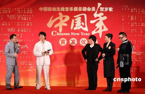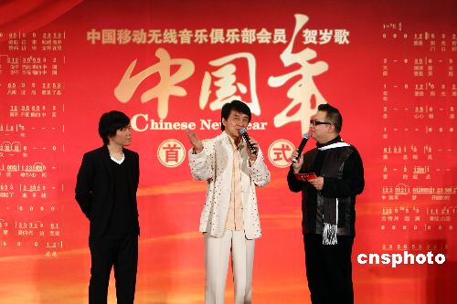 1月17日,由中國(guó)移動(dòng)無(wú)線音樂(lè)俱樂(lè)部與北京風(fēng)向樂(lè)動(dòng)數(shù)字音樂(lè)公司共同打造的賀歲歌《中國(guó)年》在京首發(fā),并傳至中國(guó)移動(dòng)無(wú)線音樂(lè)門戶供大家下載。《中國(guó)年》由王平久作詞,北京奧運(yùn)會(huì)開幕式音樂(lè)團(tuán)隊(duì)核心成員常石磊作曲,并由成龍、譚晶、常石磊演唱,曾在奧運(yùn)歌曲創(chuàng)作、演唱中有突出表現(xiàn)的三人如今組成特殊的奧運(yùn)組合,共同用歌聲來(lái)拜年。中新社發(fā) 杜洋 攝