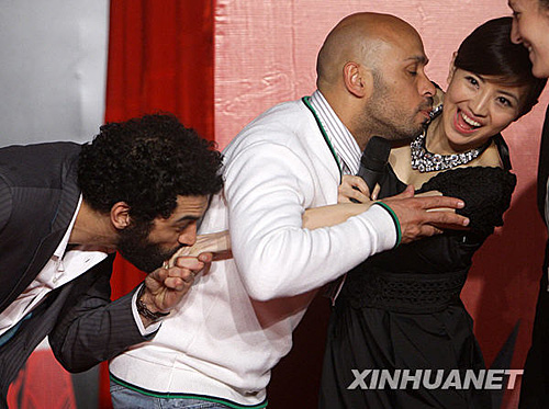 4月9日,法國(guó)電影《孤獨(dú)二兄弟》的導(dǎo)演兼主演、法國(guó)家喻戶曉的笑星組合朗茲·貝迪亞(左)和埃里克·朱多爾(中)在接受采訪時(shí)逗樂。當(dāng)日,由中國(guó)國(guó)家廣播電影電視總局、法國(guó)駐華大使館等單位共同主辦的“2009中法文化交流之春暨第六屆法國(guó)電影展映活動(dòng)”在北京開幕,該活動(dòng)將向中國(guó)觀眾展現(xiàn)當(dāng)代法國(guó)藝術(shù)舞臺(tái)的活力和創(chuàng)造力,為中法兩國(guó)藝術(shù)家提供交流的機(jī)會(huì)。邢廣利 攝