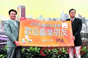 萬(wàn)慶良向臺(tái)灣同胞致送亞運(yùn)會(huì)邀請(qǐng)函。