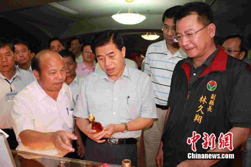 中新社苗栗8月19日電 (記者 張傳熙)正在臺灣山區(qū)縣苗栗訪問的廣東省省長黃華華,當看到苗栗出產(chǎn)的用草莓做成的酒類商品、糖果、糕點琳瑯滿目、擺滿當?shù)靥禺a(chǎn)商場貨架時大為贊嘆,連聲說:“苗栗農(nóng)產(chǎn)品開發(fā)了不得!”他希望廣東與苗栗加強合作,推動水果業(yè)的發(fā)展,推動兩地觀光農(nóng)業(yè)的交流。