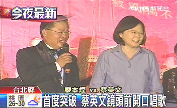 昨晚在永和市樂(lè)華夜市,“立委”廖本煙唱“小城故事”,他好幾次想找機(jī)會(huì)把麥克風(fēng)往蔡英文面前比,但她像看到火把,馬上靠邊閃。不過(guò)電視畫面顯示,蔡英文也還是首度突破自我,開(kāi)始開(kāi)口唱歌,看她嘴型,咬字還蠻完整。