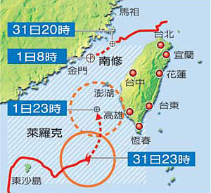 中新網9月1日電 據臺灣《聯合報》報道,昨晚八點半,臺灣“氣象局”發布臺風“萊羅克”海上警報,今天凌晨兩點半再度發布陸上警報。移動速度緩慢的“萊羅克”正在打轉,今明兩天是最靠近臺灣的時候,今晚暴風邊緣可能在臺灣西南沿海附近。另外,臺風“南修”也會影響臺灣部分地區。