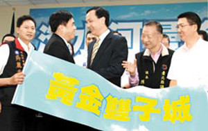 中新網9月6日電 據臺灣《中國時報》報道,臺北市長郝龍斌與國民黨新北市長參選人朱立倫5日大陣仗召開記者會,公布“黃金雙子城--淡水河曼哈頓計劃”廣告片,這是在臺北市“花風暴”之后,郝、朱兩人首度同臺為選情造勢。郝、朱拿著“黃金雙子城、團結一定成”的布條,表達未來仍將持續推動雙城合作的決心。