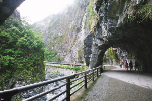 當我們乘坐的旅游大巴車進入太魯閣大峽谷中最險峻也最值得一看的九曲洞峽谷時,我驚奇地看到,進出九曲洞的游客個個頭頂安全帽。導游說,前幾年的臺灣大地震,太魯閣大峽谷不少山體巖石松動,山上經常有細小石子滾落下來,為了避免傷及游客,景點管理者要求每位游客必須佩戴安全帽方能進入九曲洞游覽區參觀。