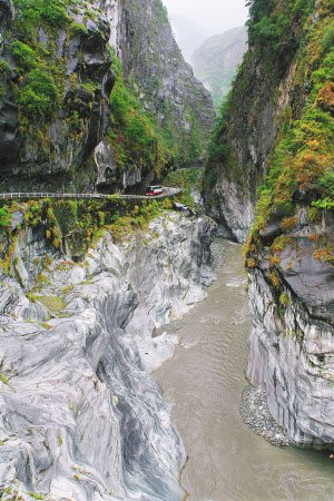 按行程安排,我們當晚就要馬不停蹄地趕往100公里外的宜蘭縣。到宜蘭縣已是晚上9點多,下榻的酒店就在路邊。沿途有不少都是溫泉酒店,大部分建在路邊,規模不大,都是私人經營,但很干凈。次日早餐后,我們冒雨乘車駛上橫貫臺灣南北的中橫公路。當天主要是游覽臺灣著名景點———花蓮縣的太魯閣大峽谷。
