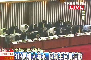 中新網9月28日電 據臺灣TVBS報道,針對919“凡亞比”臺風造成高雄市大淹水,市長陳菊連日來遭到相當多的指控,今日,在市議會總質詢時,陳菊特別率領市府官員向市民道歉。