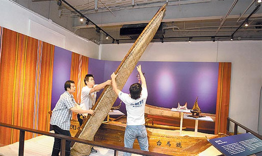 “國史館”接收后,花了近二十萬元修復。這次展覽,“臺馬號”因體積龐大,只能平放船身,無法豎起藤編的船帆。