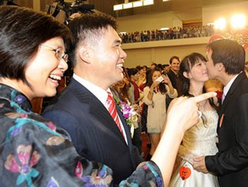 中新網(wǎng)10月11日電 據(jù)臺(tái)灣“今日新聞網(wǎng)”報(bào)道,臺(tái)北市政府10日下午舉行“花現(xiàn)臺(tái)北2010聯(lián)合婚禮”,臺(tái)北市長(zhǎng)郝龍斌與夫人高閬仙現(xiàn)身為140對(duì)新人證婚,并祝福新人“幸福久久、十全十美、雙雙對(duì)對(duì)、萬年富貴”。
