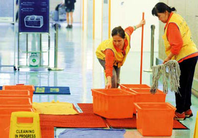 為了避免影響觀瞻,桃園航空站原本規(guī)定室內(nèi)漏水不得用水桶承接,只能用地毯或毛巾放在地上吸水,飽和后再擰到水桶搬走。可是昨天的漏水量太大,地毯及毛巾已經(jīng)無法應(yīng)付,清潔人員還是被迫搬來十多個(gè)水桶接水。