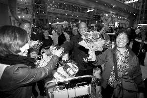 昨晚,首批被困北京游客抵京。20時(shí)剛過,游客紛紛走下飛機(jī),多為白發(fā)老人。在接機(jī)口,神舟國旅工作人員將鮮花送到老人手上,老人們表示感謝,“我們命大,感謝大家關(guān)心。”