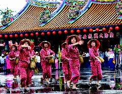 雖然下著大雨,但客家鄉(xiāng)親熱情依舊,個(gè)個(gè)打上客家花布領(lǐng)巾,組成客家味十足的踩街隊(duì)伍,由縣長(zhǎng)領(lǐng)軍,從冬山鄉(xiāng)街道開(kāi)始踩街至大興振安宮。