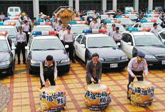 中新網(wǎng)11月28日電 據(jù)臺灣《聯(lián)合報》報道,為了宣示查賄的決心,屏東縣調(diào)查站主任、屏東“地檢署”檢察長、屏東縣警察局副局長27日在縣立棒球場前擊打?qū)懹小扮娯赋龀V選難逃”的大鼓,宣示“鐘馗抓賄車隊”啟動。 (陳昆福 攝)