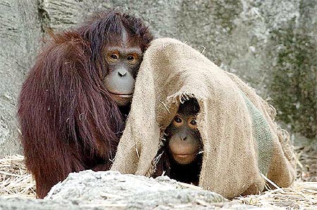 臺北市動物園里的猩猩也冷到受不了,蓋著麻布抵擋寒風,沒搶到的只好依偎在同伴身旁取暖。(圖:臺灣《中國時報》)