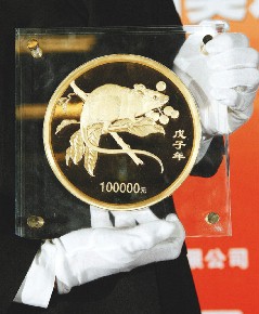 據臺灣《聯合報》報道,臺灣中華奧委會與北京奧運紀念金幣代理商臺灣大洋金銀幣27日舉行“二○○八北京奧運紀念金銀幣慈善拍賣會”,16組拍賣商品中,最受矚目的是重10公斤的“戊子鼠年紀念金幣”,金幣厚2.5公分、直徑18公分,拍賣底價為1220萬,最后以1225萬元賣出。