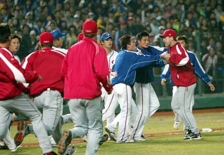 據臺灣媒體報道,這場在臺中舉行的大戰中,也出現比賽之外的不必要插曲。中國臺北隊球員力阻加拿大隊追平分,情緒自然激昂,卻沒想到球員額外的情緒發泄惹惱了加拿大球員,造成雙方球員跑入場中推擠理論,連球迷也紛紛丟擲雜物進場,爆發八搶三奧運棒球資格賽開賽以來最大沖突。