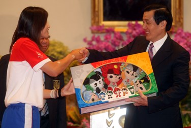 中華臺(tái)北奧運(yùn)代表團(tuán)掌旗官賴(lài)圣蓉(左)贈(zèng)送奧運(yùn)福娃給馬英九。(“中央社”圖)
