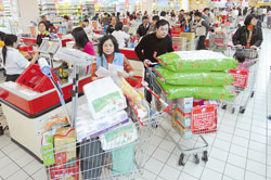 量販業(yè)者形容昨天是“最像假日的上班日”,尤其是夜間推出九折促銷,吸引不少民眾犧牲睡覺時間來采買,估計有二成來客選在凌晨消費。家樂福夜間購物滿2000元,再送200元折價券,各店從凌晨起收銀線即大排長龍,汐止店甚至需排隊一個小時才能順利結(jié)帳。