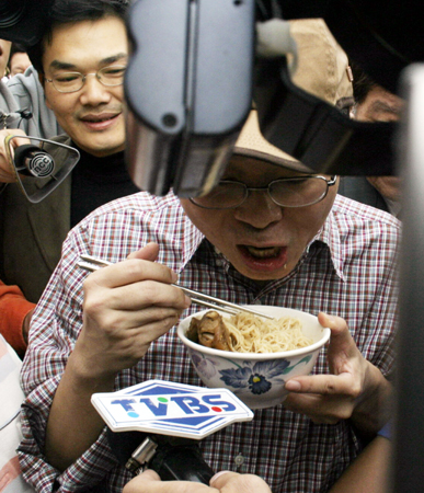 邱毅吃民眾送上的豬腳面線去霉氣。