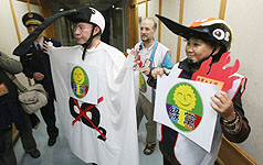 綠黨及人民火大聯盟參選人抗議,因穿著特殊服裝被警察擋在樓下,無法上樓抽政黨號次。 來源:“中央社”