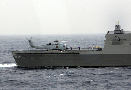 S-70C反潛直升機(jī)降落迪化級(jí)軍艦飛行甲板,仿真加油及魚雷管掛卸載作業(yè)。