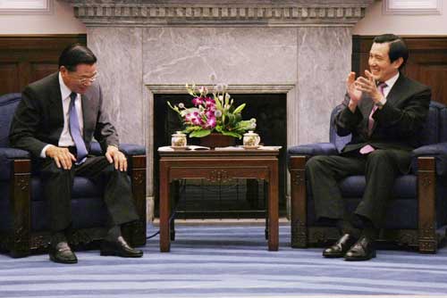 馬英九(右)六月九日接見海基會董事長江丙坤等即將前往大陸協商的代表團成員。(“中央社”圖)
