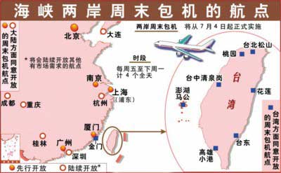 三、飛行航路。雙方同意盡快協商開通兩岸直達航路和建立雙方空管方面的直接交接程序。在直達航路開通前,包機航路得暫時繞經香港飛行(航)情報區。