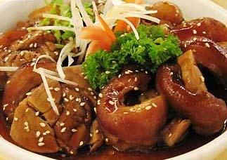 “萬巒豬腳”在制作時(shí)不放糖、鹽和味精,只用醬油,豬腳要用10多種草藥和香料腌制,在鹵制時(shí)要把溢出的油汁收干,吃起來沒有油膩感。
