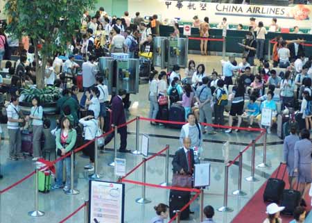 兩岸周末包機(jī)首航,華航四日分別有兩班機(jī)飛往大陸,柜臺一早擠滿旅客,滿帶期待參與首航。 “中央社”圖