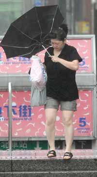 “鳳凰”臺風來襲,臺北市街頭不時出現強風讓路過行人手中的雨傘直接開花。