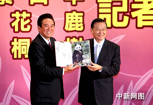 中新網臺北11月6日電 大陸海協會會長陳云林與臺灣海基會董事長江丙坤今日上午在臺北出席兩岸互贈珍稀動植物記者會,大陸贈送的除了大熊貓“團團”、“圓圓”外,還有珙桐樹,臺灣方面回贈的是長鬃山羊和梅花鹿。