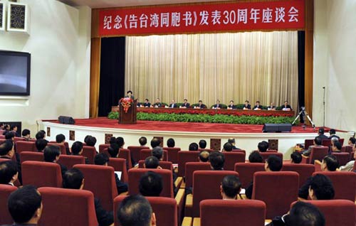 中新網北京12月31日電 紀念《告臺灣同胞書》發表30周年座談會31日上午在人民大會堂隆重舉行。中共中央總書記、國家主席、中央軍委主席胡錦濤出席座談會并發表重要講話。