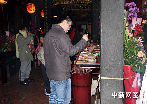 到寺廟去虔誠拜拜,祈求來年平安是成千上萬臺胞春節必做的功課。 中新網記者 陳立宇 攝