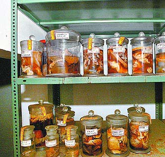 記者通過40米的通道,走到第二棟地勢較低的建筑內(nèi),記者攜帶探照燈,穿過一條白墻走道才轉(zhuǎn)彎進入一個房間,抬頭赫見整排約50罐尸罐,嚇得忍不住后退。原來4排鐵架上擺放裝有各種器官和尸塊的罐子,猶如一座人體器官博物館,令人全身起雞皮疙瘩。