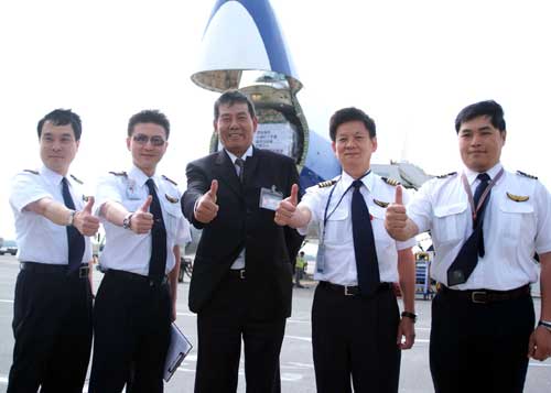 華航五月十五日派出747-400貨機直飛成都,成為兩岸人道救援包機的首航記錄,四名機組人員起飛前比起大拇指。(“中央社”圖)