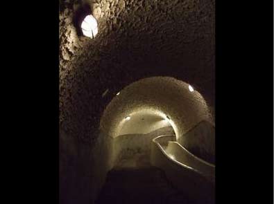 記者當(dāng)日潛入探險的即為西密道。這條看似簡單的密道長180米,高210公分、寬223公分,有86臺階、45個防爆燈,滑梯90米長,還設(shè)有獨立電源、空調(diào)、排水、緊急廣播。建材則是防爆白洋灰、鋼筋水泥。密道坡度很陡,一路走下,就彷佛進入了時光隧道,四周昏暗慘白的氛圍,嘿,還真感覺到一些風(fēng)聲鶴唳的緊張氣氛。雖說從建好到現(xiàn)在,密道完全沒有使用過,詭異的是,光滑的溜滑梯上卻留有許多黑色長條刮痕,難道是人沒使用過,卻曾運輸過槍械軍火?