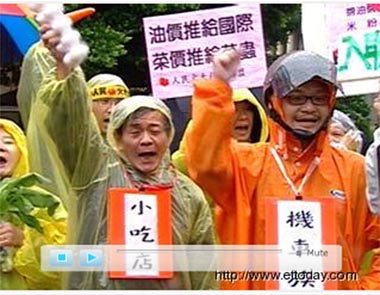 中新網11月6日電 臺灣民間團體“人民火大行動聯盟”6日著帶著蔬果、雞蛋到當局“行政院”前抗議。行動聯盟并列舉“高官何不食肉糜 言行錄”,其中陳水扁、呂秀蓮、“行政院副院長”邱義仁、“行政院經建會”主委何美玥等都榜上有名。