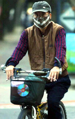 圖為一位民眾九日戴著口罩在中山紀(jì)念館騎車運(yùn)動(dòng),以免受到污濁空氣的影響。圖:臺(tái)灣《中國(guó)時(shí)報(bào)》