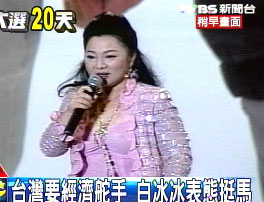 報道說,在這場晚會中,藝人白冰冰表態挺馬,特地做了一首歌,表示要投給馬英九。藝人白冰冰:“我們一定要選一個,讓我們經濟能夠起飛的總舵手,我們大家心連心,手牽手,一起來投給馬英九,讓我們經濟,贏過吃威而鋼加配補藥酒,大家說這樣好不好!”