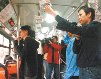 不過,馬英九勝選后,這兩天多了三位隨扈相陪,還有越來越多的媒體記者“包抄”、拍攝坐公交車過程。從出家門開始,周美青雖然表情平和,還不斷提醒大家小心,但偶爾看到攝影記者倒著走快撞到電線桿,仍會提醒:“這樣很危險。”