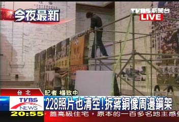 中新網(wǎng)4月3日電 據(jù)臺(tái)灣《聯(lián)合報(bào)》報(bào)道,臺(tái)北“中正紀(jì)念堂”蔣介石銅像今天將再“變身”。臺(tái)灣“二•二八”基金會(huì)昨天進(jìn)入銅像大廳重新布置,先拆除正中央的鋼架,并懸掛具政治宣傳意味的展品。